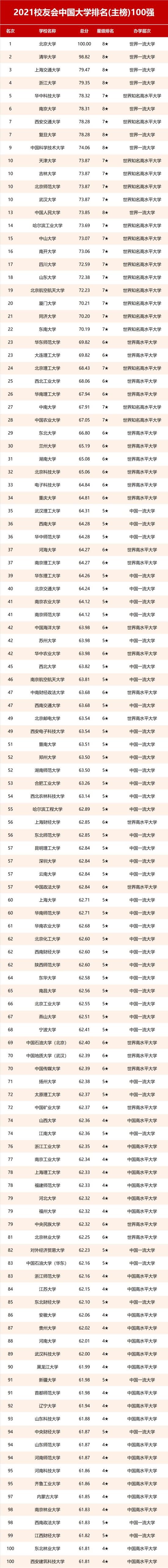 校友会2021中国大学排名分为总榜、主榜、副榜和分类榜。校友会2021中国大学排名总榜分为公办高校类、民办高校类和高职院校类等三类排名。其中,公办高校类排名按“主榜”和“副榜”形式呈现,综合理工农林师范民族财经等类高校中综合性较强大学的全国排名在“主榜”中呈现,艺术体育语言政法等类高校中学科较为单一的单科性大学的全国排名在“副榜”中呈现。民办高校类和高职院校类排名按I类、Ⅱ类和Ⅲ类等3个“分类榜”形式分别呈现。