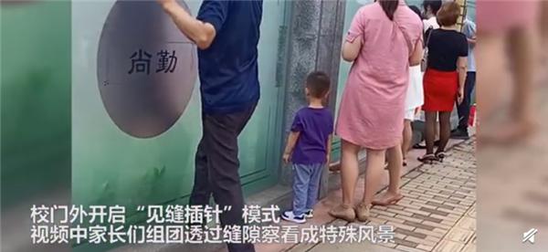 8 月 31 日,四川成都新生上学家长不放心,校门外开启 " 见缝插针 " 模式,纷纷贴墙 " 暗中观察 ",视频中家长们组团透过缝隙察看成特殊风景线。