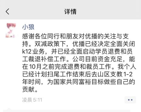 9月13日,新东方在线副总裁、东方优播CEO朱宇在微信朋友圈发文,表示新东方在线旗下东方优播已决定全面关闭K12业务(注:从小学一年级到高中三年级),并已经全面启动学员退费和员工裁退补偿工作。新东方在线目前资金充足,能在10月之前完成退费和裁员工作。