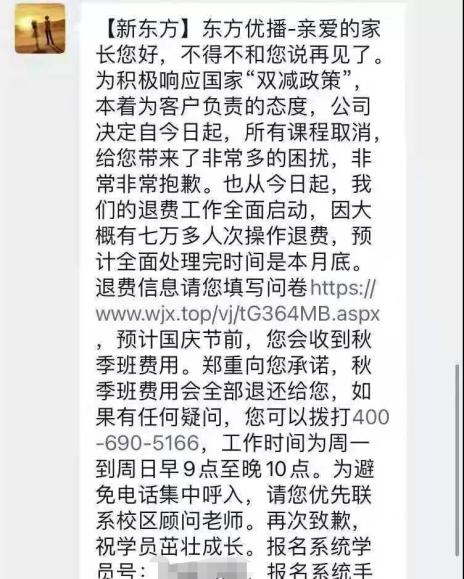 据一份相关内容聊天记录截图得知,东方优播工作人员曾告知家长填写退费信息调查问卷,国庆前将会收到东方优播退费,且消息中再次强调,秋季班费用会全部退还。